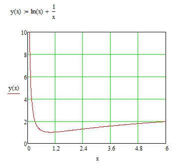 Поведение функции на проомежутке от х=0 до х=1 определяется функией 1/х (то есть при увеличении х функция падает с бесконечности), при х>1 поведение определяется ln(x) и функция возрастает при увеличении х (при увеличении х значение 1/ч стремится к нулю).