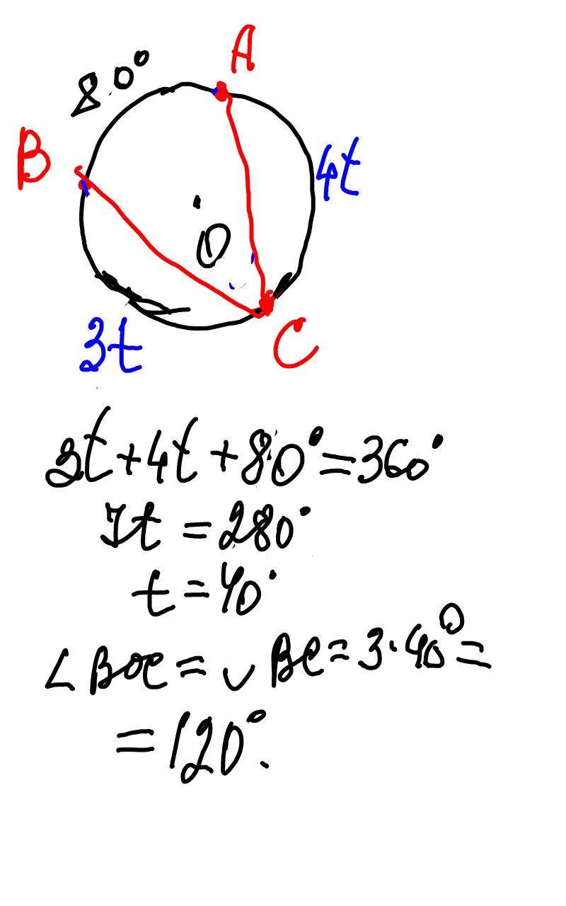Точки А,В,С лежат на окр-сти с центром в точке О. Дуга ВС: к дуге АС=3:4,угол ВСА=40.Чему равен угол ВОС?