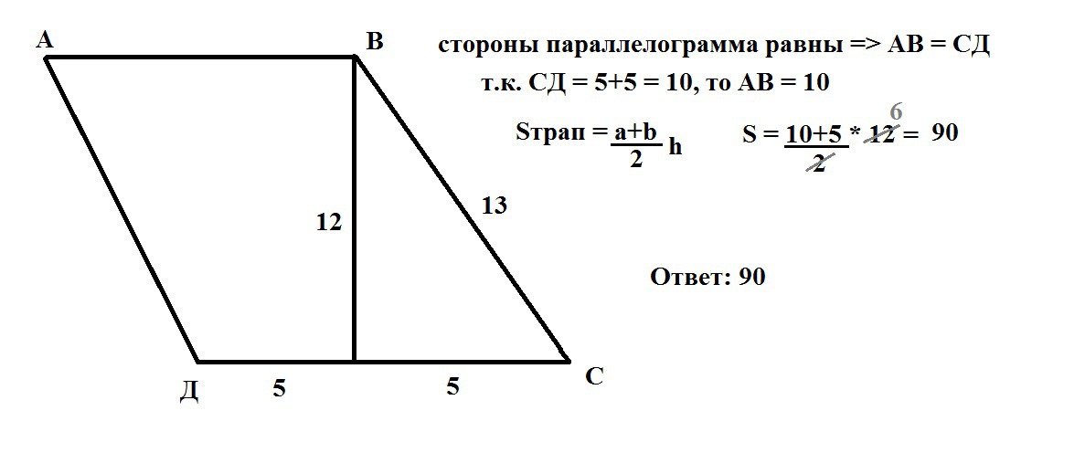 Но высота дана в условии - 12. И потом, здесь нужно найти площадь трапеции, а не параллелограмма. Трапеция здесь - прямоугольная, образована высотой и основаниями, меньшее из которых равно 5.