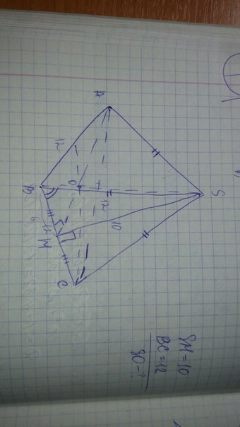 Апофема правильной треугольной пирамиды SABC равна 10. Сторона основания равна 12. Чему равна высота пирамиды?