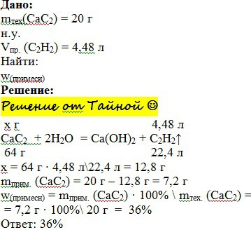 з технічного кальцій кальцій карбіду масою 20 г утворюється ацетилен об'ємом 4,48 л (н.у). Визначте масову частку домішок
