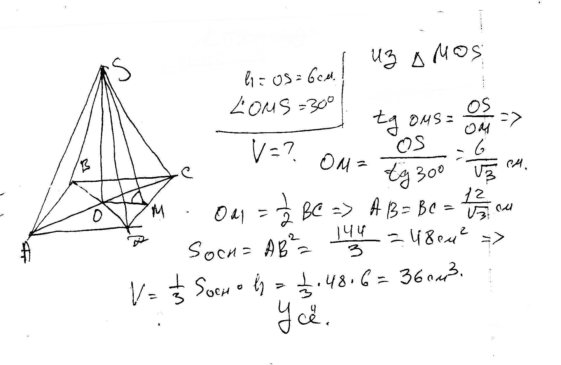 Высота правильной 4угольной пирамиды равна 6см и образует боковой гранью угол 30градусов . Найдите объем пирамиды . С рисунками желательно