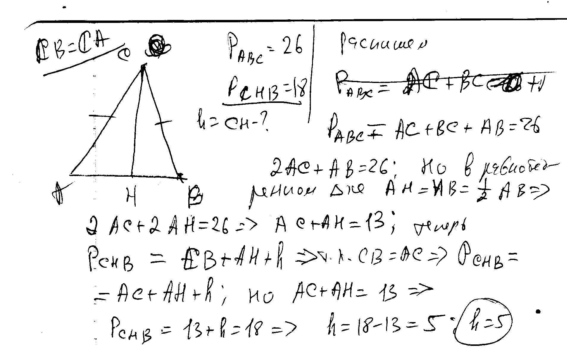 Найдите высоту СН равнобедренного треугольника АВС(АС=ВС),если периметр треугольника АВС равен 26,а периметр треугольника АСН равен 18.