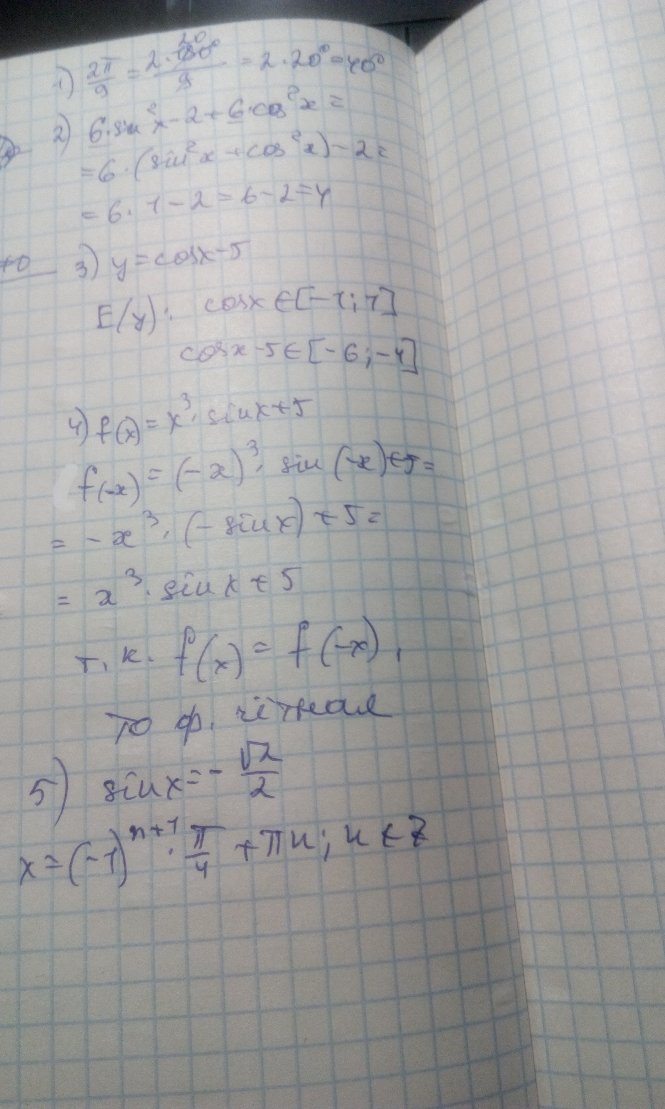 1)Найти градусную меру угла,выраженного в радианах 2п/9