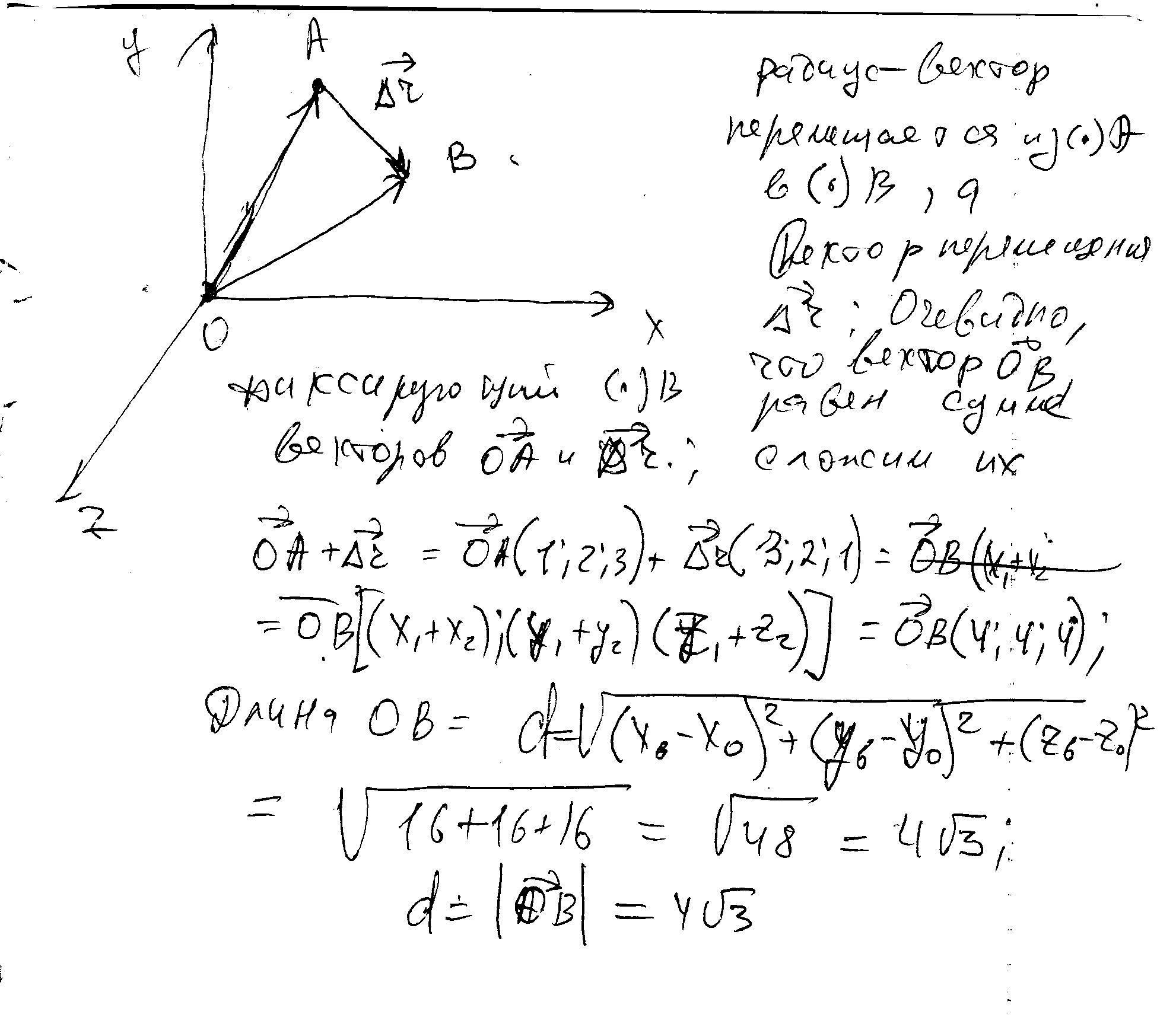 Тело из точки 1 с координатами (1;2;30 м переместилось в точку 2. Компоненты вектора перемещения ∆r равны (3;2;1) м. Найдите расстояние от начала координат до точки 2.