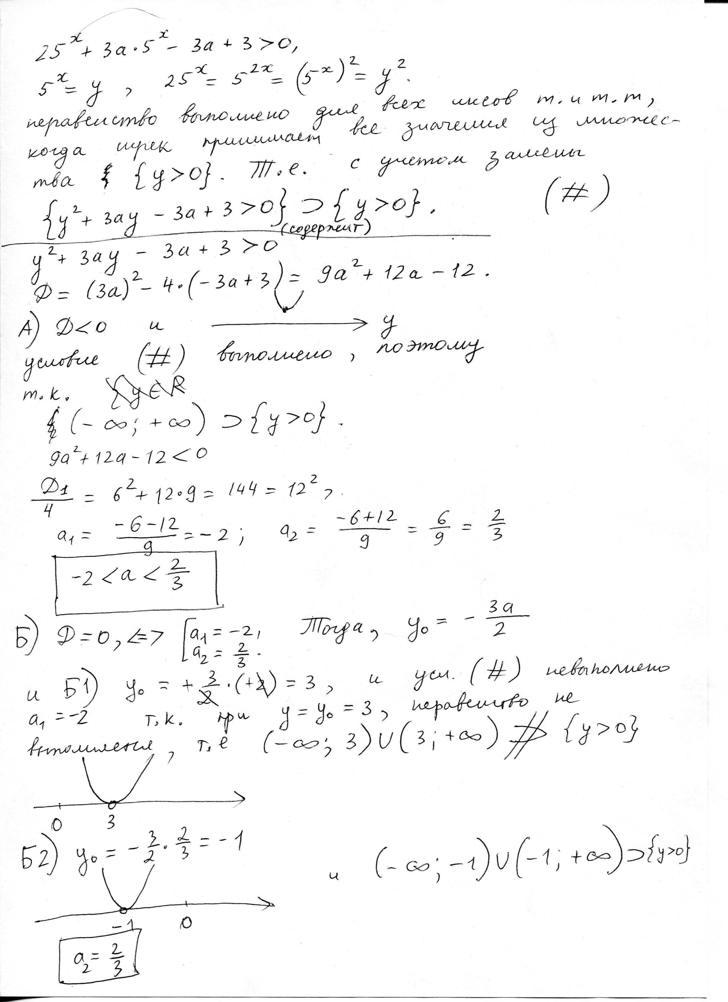 при каких значениях "a" неравенство 25^x + 3a*5^x - 3a + 3 > 0 выполнено при всех "х"