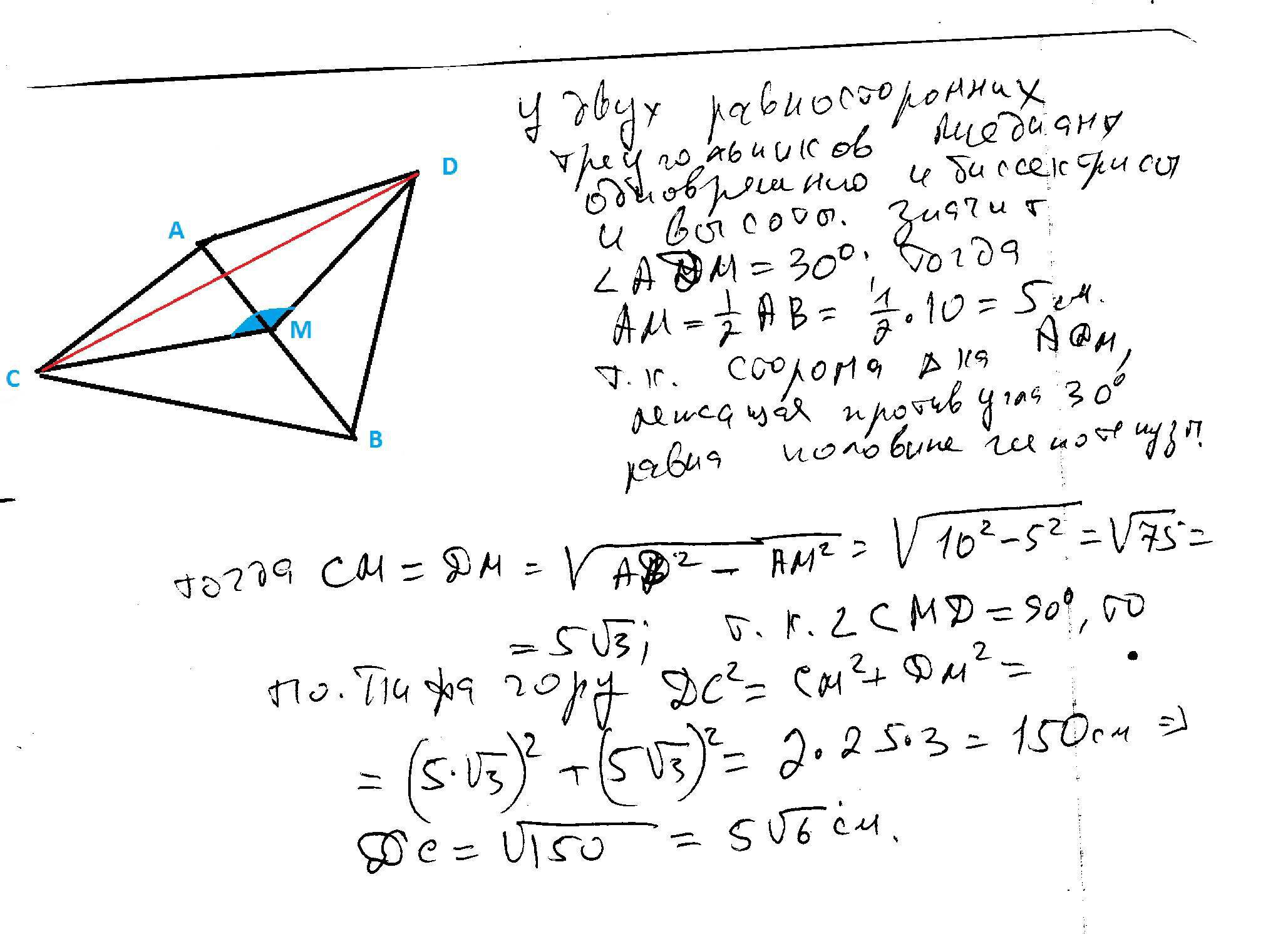 Общая сторона АВ треугольников АВС и АВD равна 10 см. Плоскости этих треугольников взаимно перпендикулярны. Найдите CD, если треугольники равносторонние.