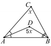 Угол между биссектрисами AD и BD треугольника ABC в пять раза больше угла при вершине C. Чему равен угол при вершине C?