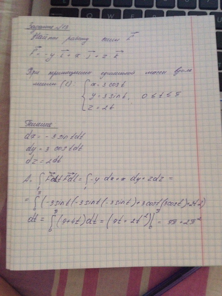 F по длине L находим работу- интеграл FΔt от 0 до pi и подставив вычислим