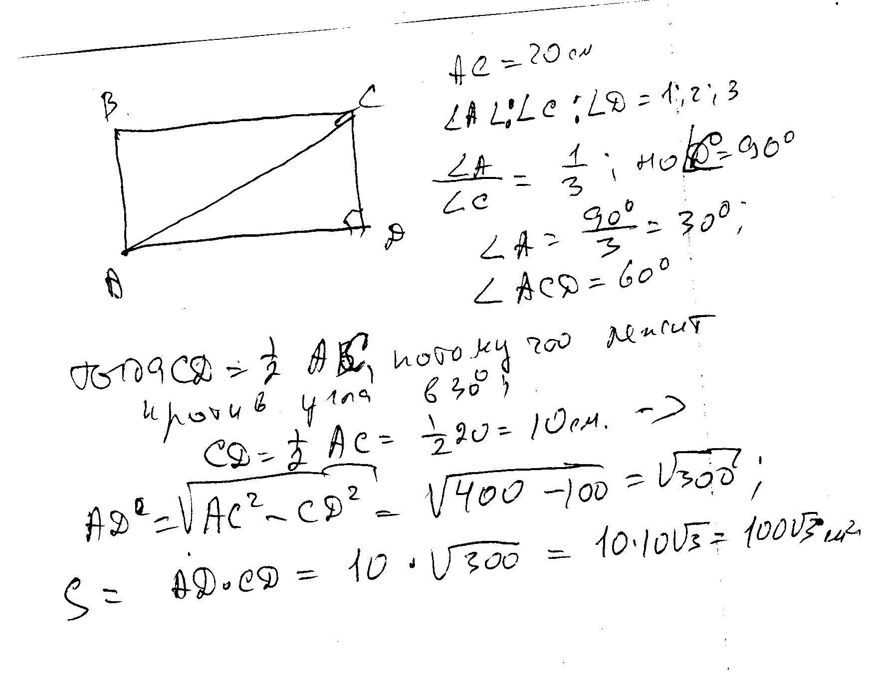 найдите площадь прямоугольника ABCD, у которого диагональ AC=20 см, и углы треугольника ADC относятся как 1:2:3