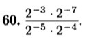 2) frac{2 ^{-3}*2 ^{-7}  }{2 ^{-5}*2 ^{-4}} = frac{2 ^{-3-7} }{2 ^{-5-4} }  frac{2 ^{-10} }{2 ^{-9} } =2 ^{-10-(-9)} =2 ^{-10+9} =2 ^{-1} = frac{1}{2} =0.5