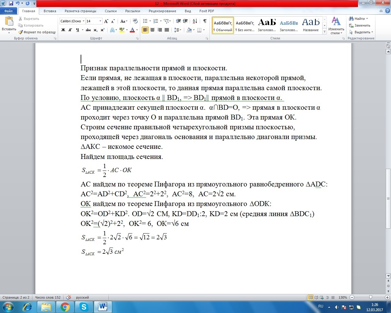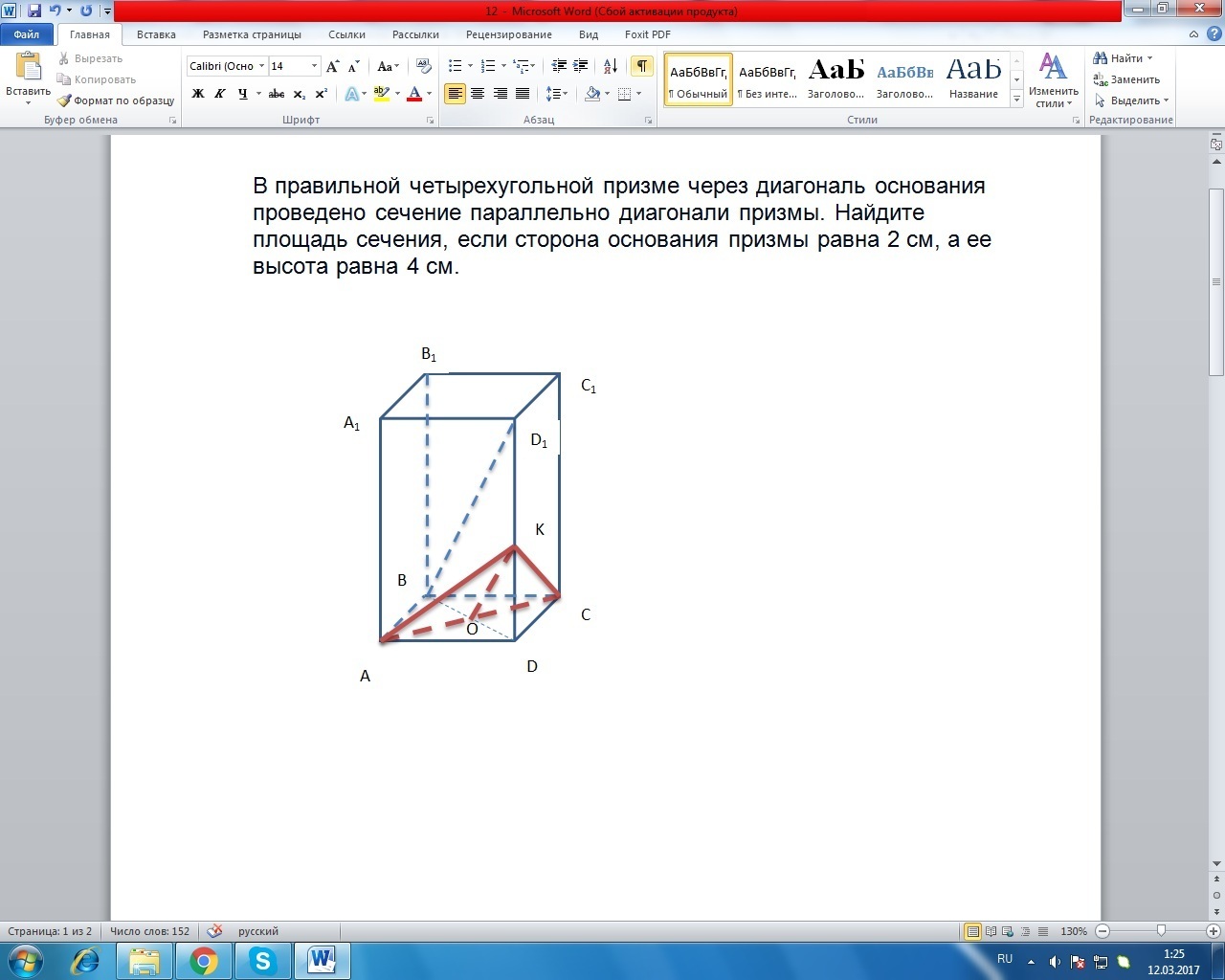 В правильной четырехугольной призме через диагональ основания проведено сечение параллельно диагонали призмы. Найдите площадь сечения, если сторона основания призмы равна 2 см, а ее высота равна 4 см.