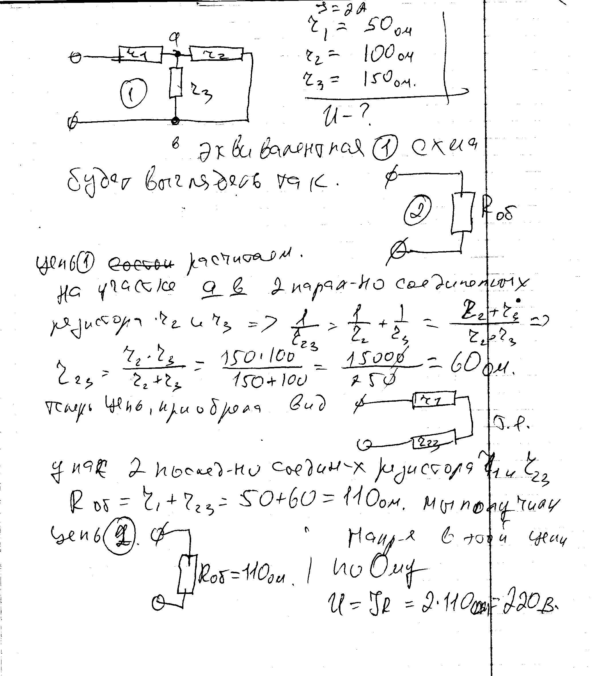 визначити еквівалентний опір на загальних схемах де r1=50 Om; r2=100 Om; r3=150 Om; а також напруга при струмі I=2 A