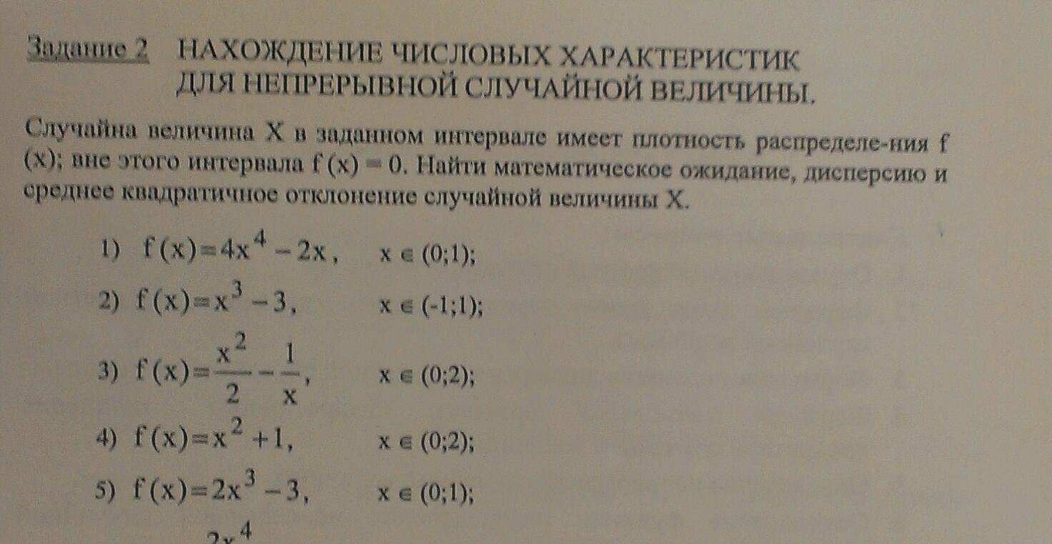 Матожидание M=интеграл от 0 до 1 ((-1*x/2,5)x*(2*x³-3))dx= интеграл от 0 до 1 (2*x⁴-3*x)dx=(2*x⁵/5) - 3*x²/2 от 0 до 1=2/5-3/2=0,4-1,5=0,44.