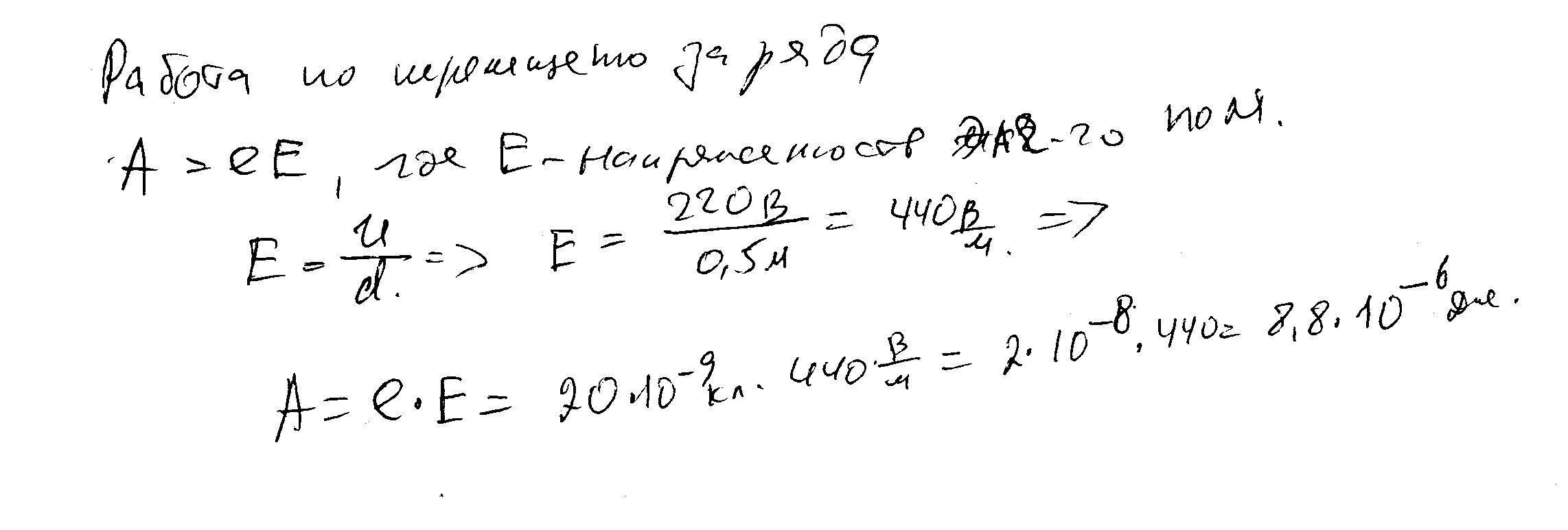 в однородном электрическом поле переместили заряд 20 мккл в направлении силовой линии на расстояниие 50см разность потенциалов между начальной и конечной точками равна 220 в.найти напряженность поля и работу электрического поля по перемещению заряда