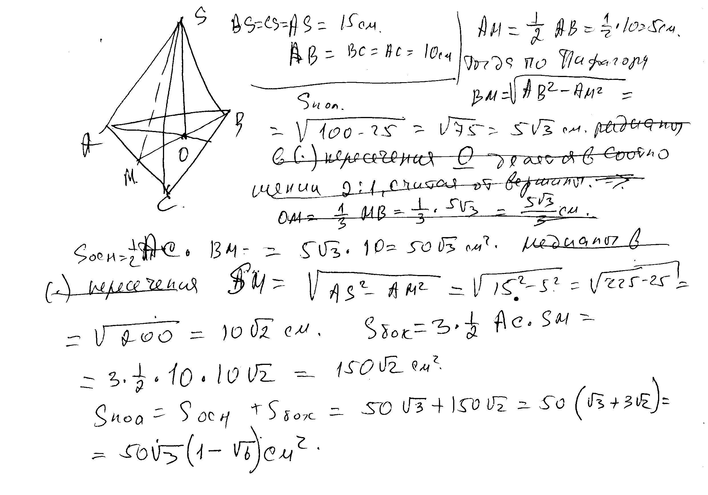 В правильной треугольной пирамиде боковое ребро 15 см, а сторона основания 10см. Найдите площадь полной поверхности пирамиды