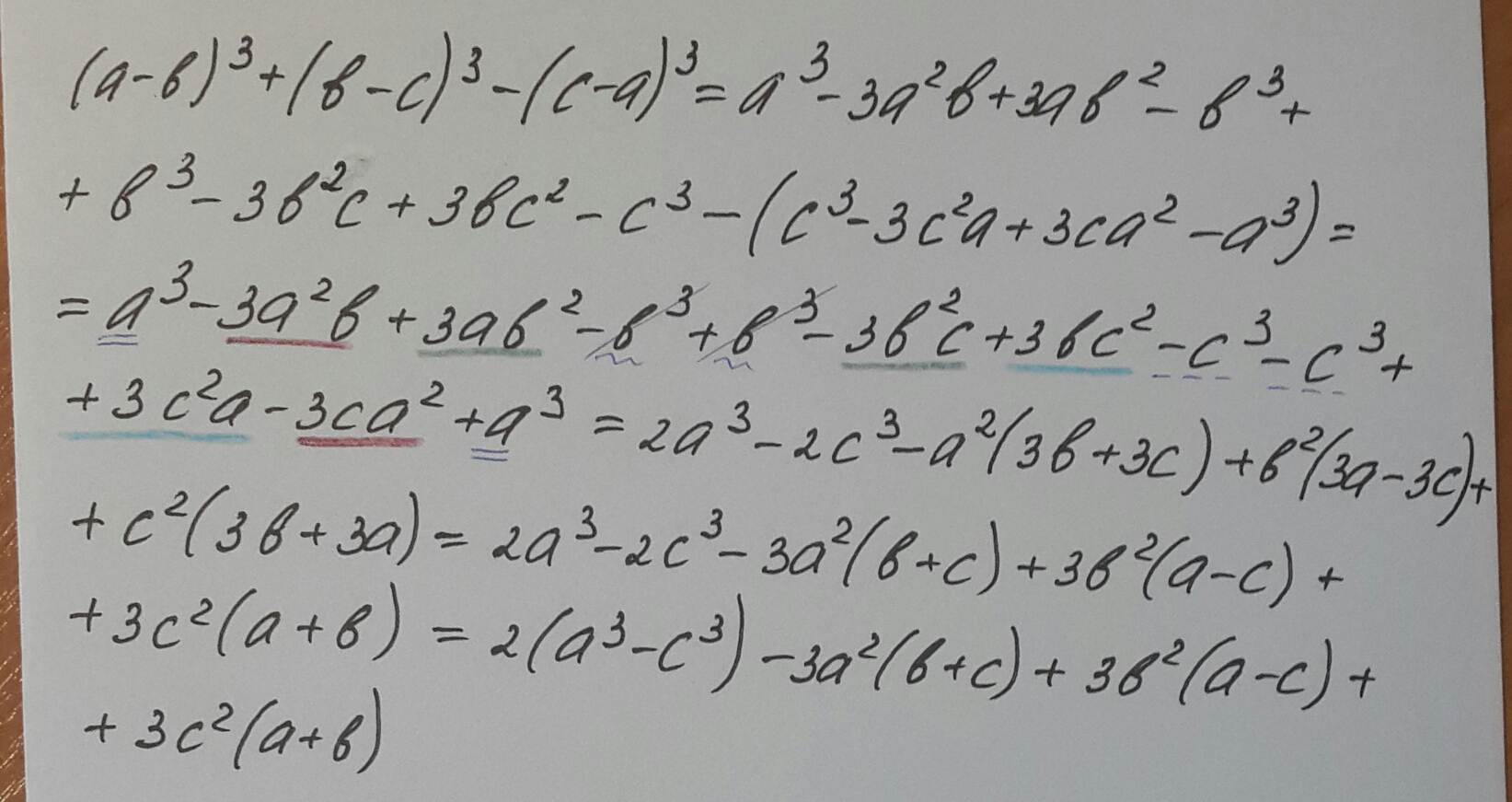 Раскладывал на множители по формуле: куб разности - (a-b)^3 = a^3 - 3a^2b + 3ab^2 - b^3