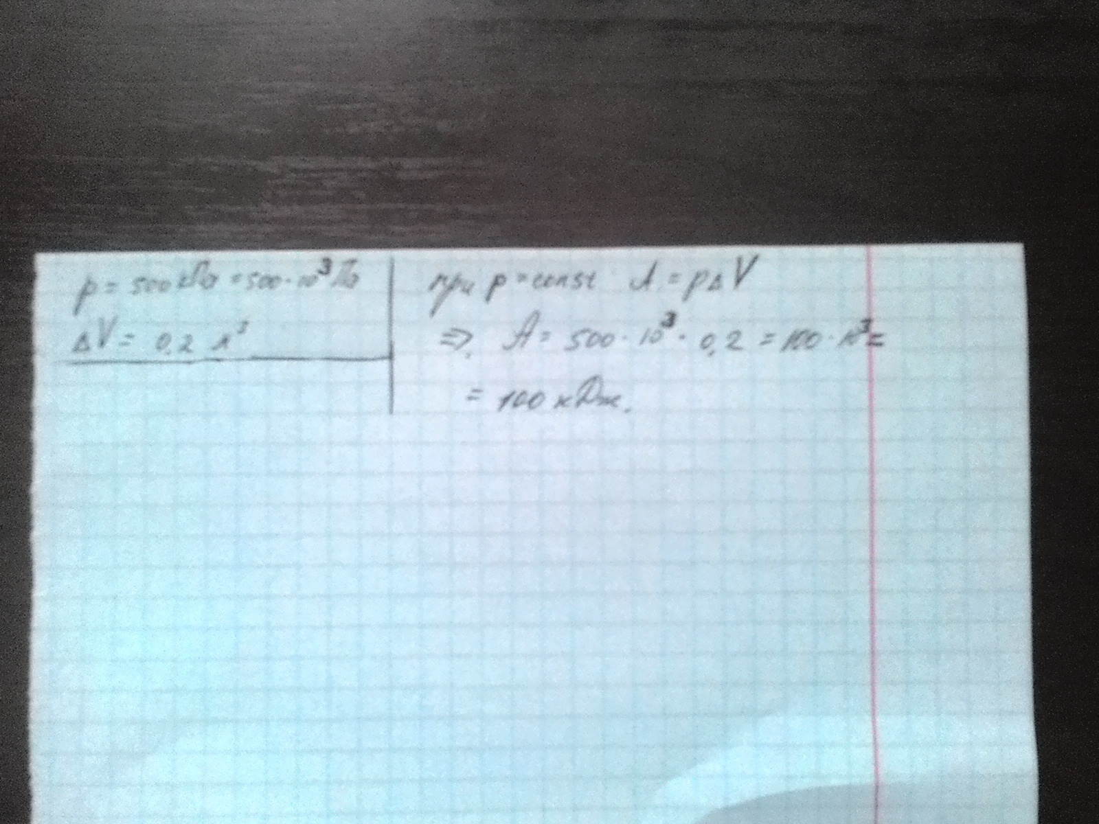 вычислите работу, совершаемую газом при давлении 500 кПа, если объем газа изменился на 0,2 куб. м.