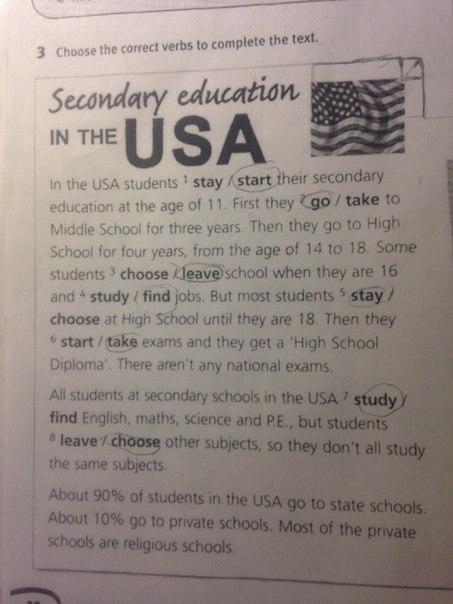 в 11 лет.Сначала они ходят в среднюю школу 3 года.Затем они ходят в Старшую школу 4 года,с возраста от 14 до 18.Некоторые студенты покидают школу,когда им 16 лет и находят работу.Но большинство студентов остаются в Старшей школе до 18 лет.Затем они сдают экзамены и получают диплом старшей школы.