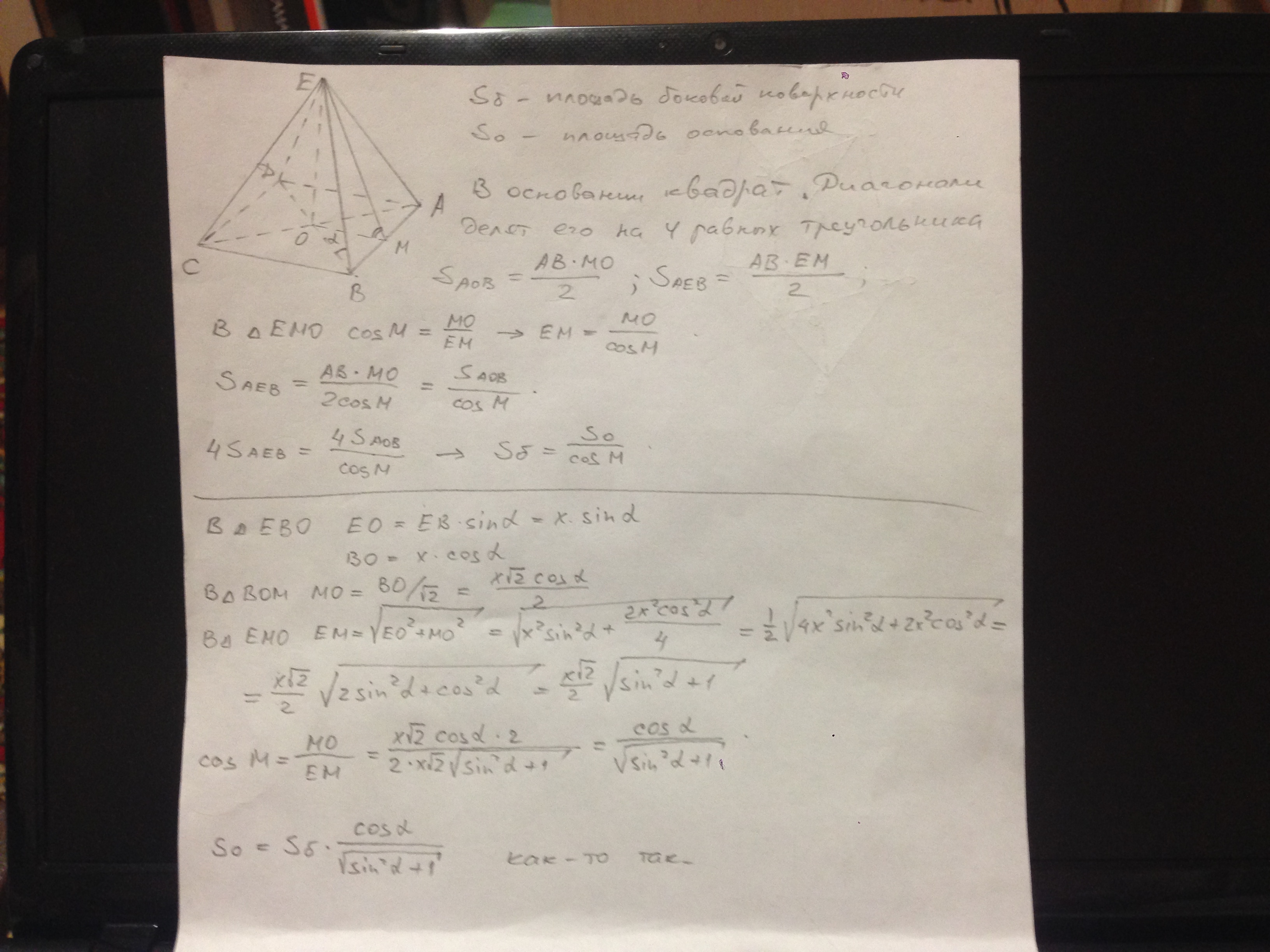 Выведите формулу, связывающую площадь основания и боковую поверхность правильной четырехугольной пирамиды, у которой все ребра наклонены к основанию под одинаковым углом
