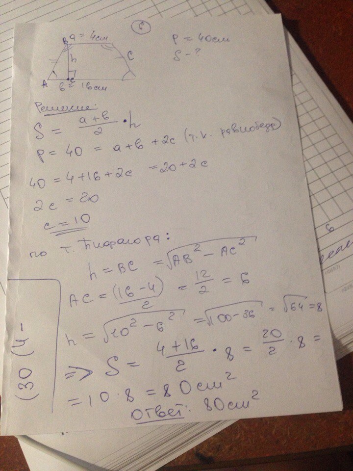 6.находим боковые стороны 16+4=20 40-20=20/2=10 теперь находим высоту по пифагора она равна 8 и по формуле( а+б)/2 *H =80см^2