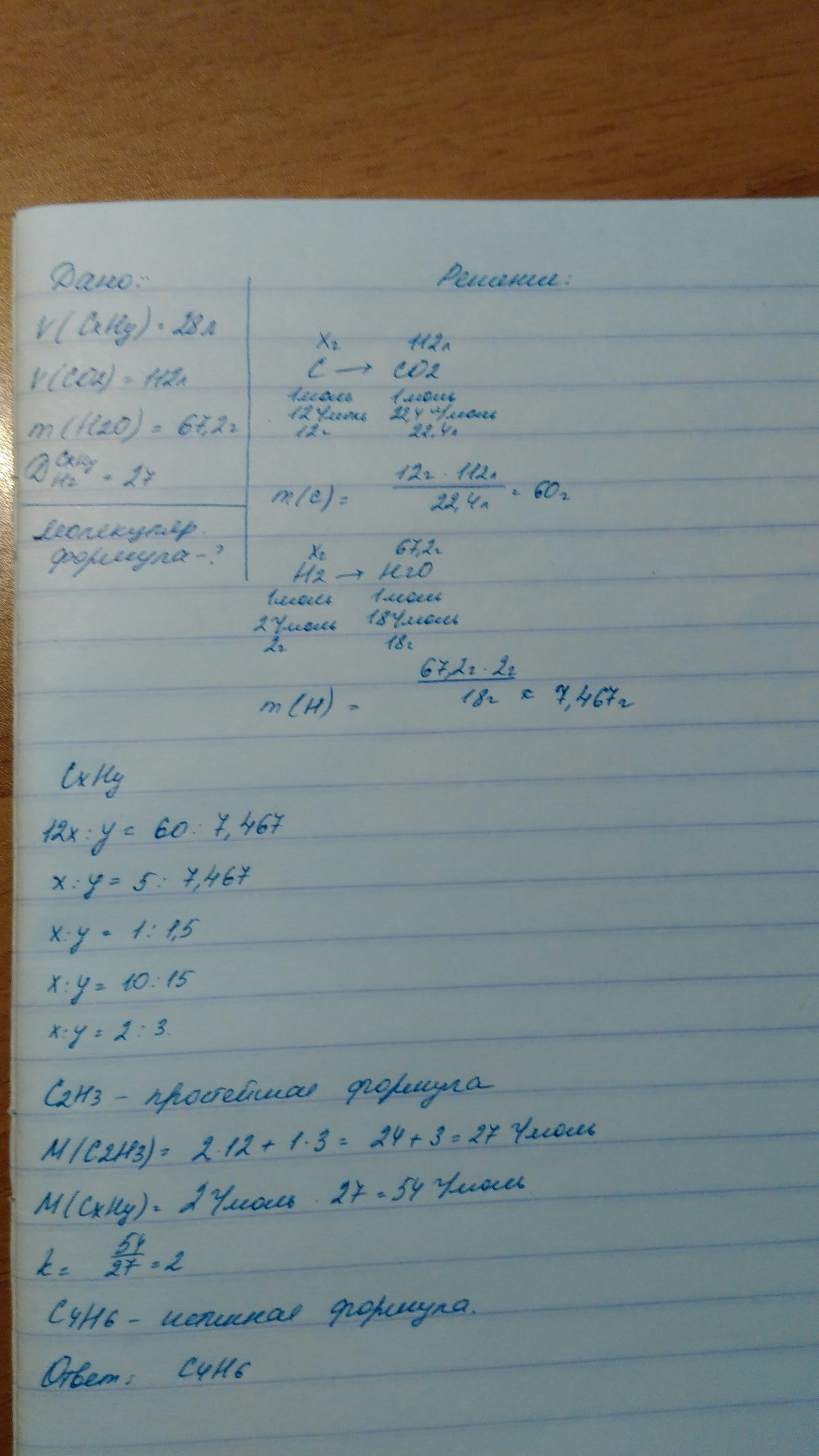 При сжигании 28л углеводорода образовалось 112л углекислого газа (н. У.) И 67,2г воды. Плотность по водороду 27. Определить молекулярную формулу вещества.