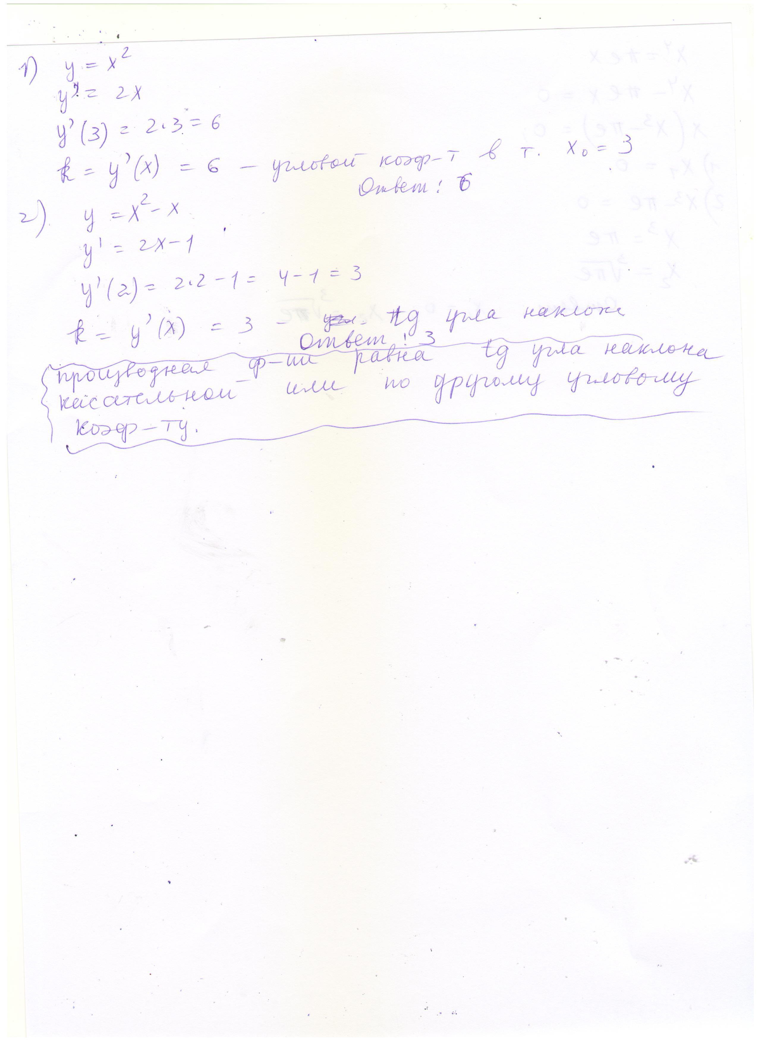 Помогите пожалуйста решить. 1) Найдите угловой коэффициент касательной к графику функции y=x2 в точке с абсциссой X0=3 2)Найдите тангенс угла наклона к оси абсцисс касательной к графику функции y=x2-x в точке с абсциссой x0=2
