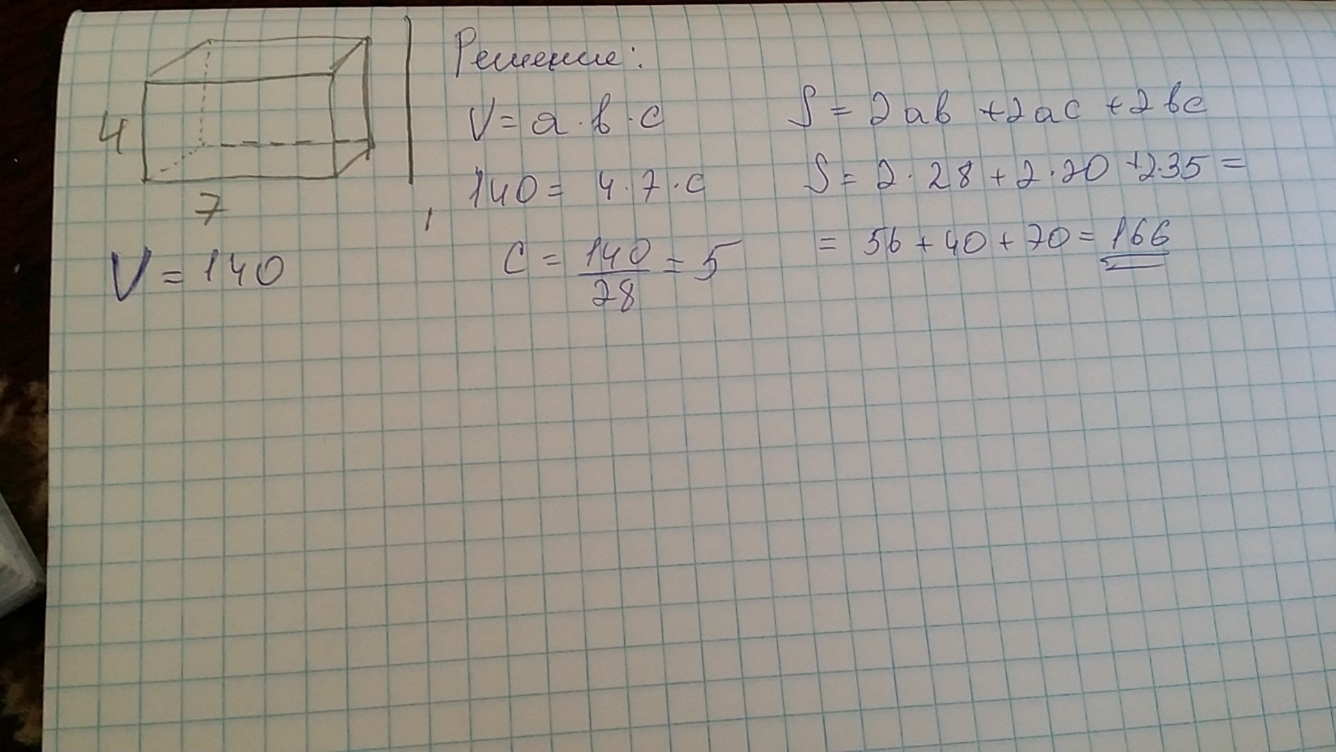 ДВА РЕБРА ПРЯМОУГОЛЬНОГО ПАРАЛЛЕЛЕПИПЕДА,ВЫХОДЯЩИЕ ИЗ ОДНОЙ ВЕРШИНЫ РАВНЫ 7 И 4.ОБЪЕМ ПАРАЛЛЕЛЕПИПЕДА РАВЕН 140.НАЙДИТЕ ПЛОЩАДЬ ЕГО ПОВЕРХНОСТИ.