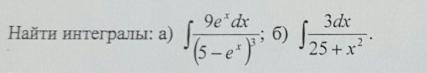 1) Пусть e^x=t ⇒x=ln(t)⇒dx=dt/t⇒∫9*e^x*dx/(5-e^x)³=9*∫dt/(5-t)³=