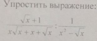frac{sqrt{x}+1}{xsqrt{x}+x+sqrt{x}} : frac{1}{x^2-sqrt{x}} = frac{sqrt{x}+1}{sqrt{x}cdot (x+sqrt{x}+1)}  cdot frac{sqrt{x}cdot (xsqrt{x}-1)}{1} =\\= frac{(sqrt{x}+1)cdot sqrt{x}cdot ((sqrt{x})^3-1)}{sqrt{x}cdot (x+sqrt{x}+1)}  =frac{(sqrt{x}+1)cdot (sqrt{x}-1)(x+sqrt{x}+1)}{sqrt{x}+sqrt{x}+1} =\\=(sqrt{x})^2-1=x-1\\P.S.; ; a^3-b^3=(a-b)(a^2+ab+b^2); ,; ; a=sqrt{x}; ,; b=1