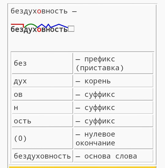 без-приставка;дух-корень;ов-суффикс;н-суффикс;ость -суффикс;(0)окончание; бездуховность основа слова