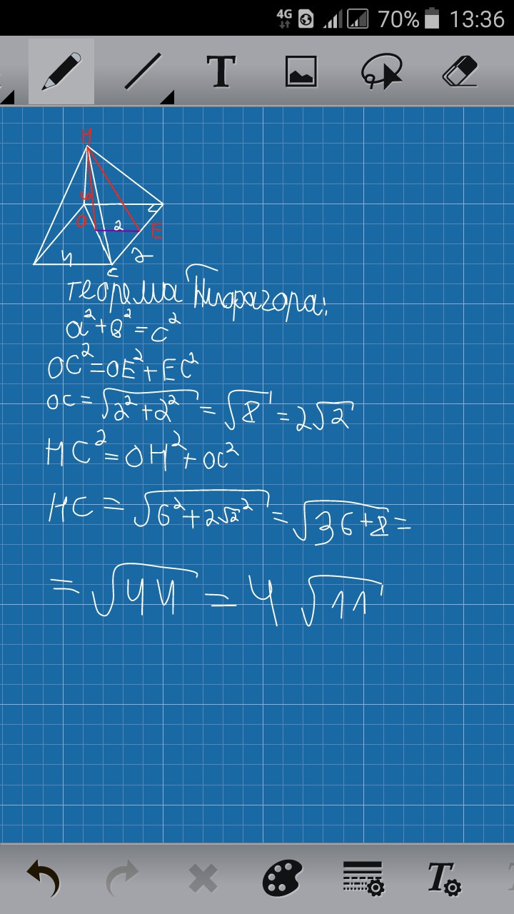 Сторона квадрата равна 4 см. Точка, равноудаленная от всех вершин квадрата находится на расстоянии 6 см от пересечения его диагоналей. Найти расстояние от этой точки до вершин квадрата.