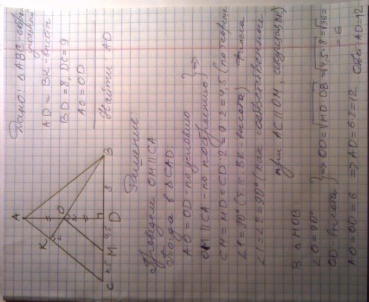 высота АД остроугольного треугольника АВС разбивает его основание на два отрезка такие, что ВД=8 и ДС=9. Найдите длину высоту АД ,если известно , что высота треугольника ВК делит высоту АД пополам