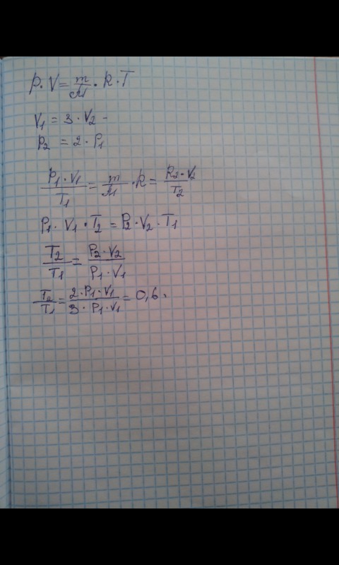 при увеличении давления идеального газа в 3 раза и уменьшении его температуры в 2 раза обьема газа