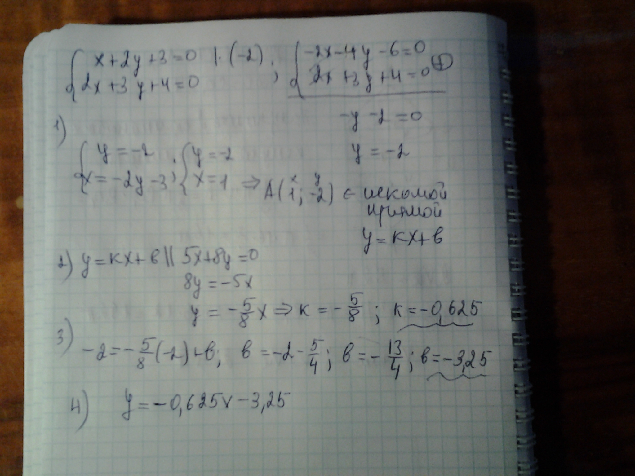 найти уравнение проходящий через точку пересечения прямых х+2у+3=0 и 2х+3у+4=0 и параллельную прямой 5х+8у=0