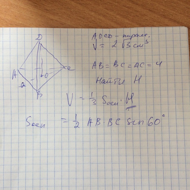 V=Sосн·Н/3=(а²√3/4)·Н/3=2√3, 16√3·Н/12=2√3,