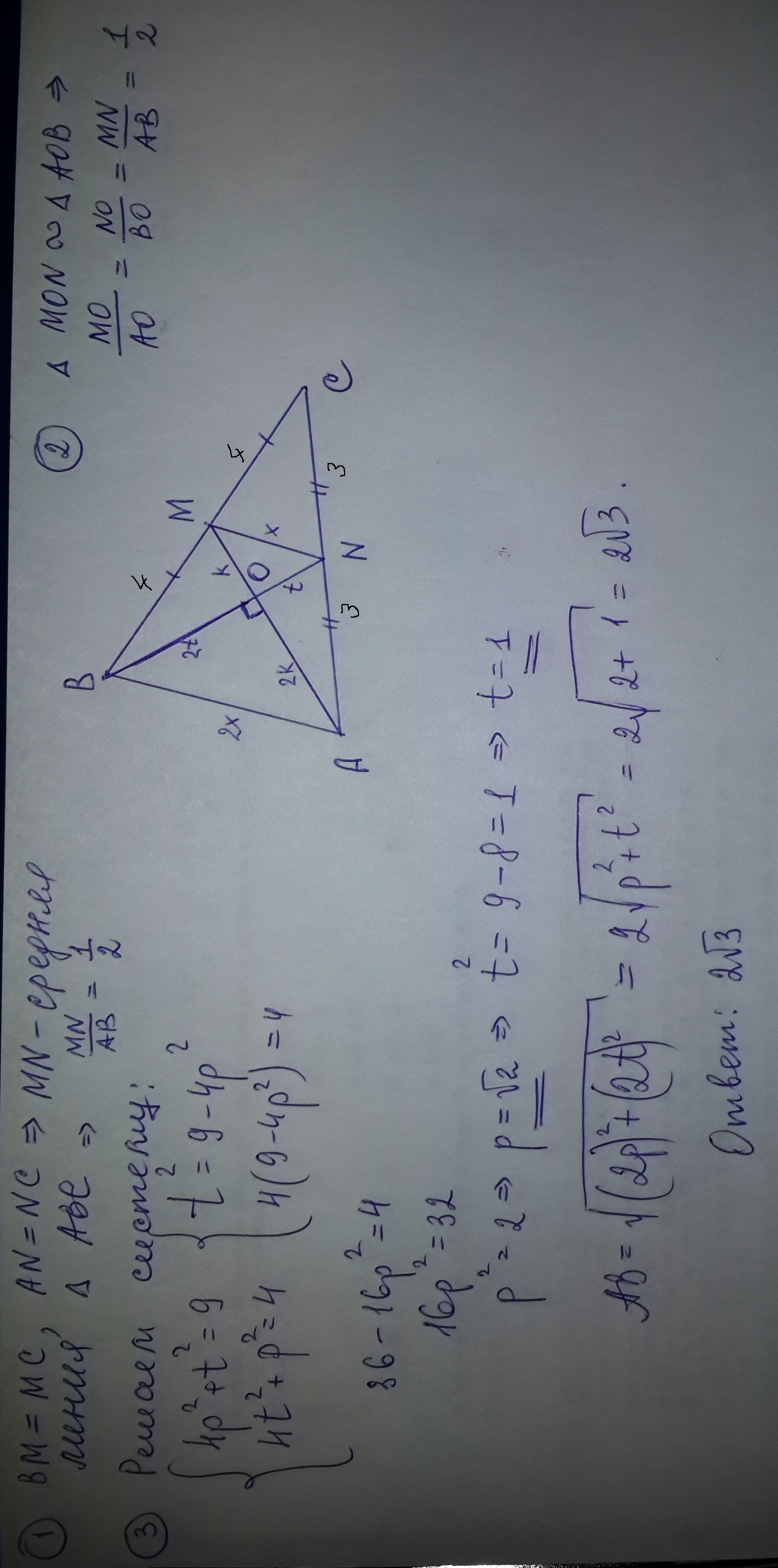 две стороны треугольника равны 6 и 8 см.Медианы,проведененные к этим сторонам, взаимно перпендикулярны.Найти третью сторону треугольника