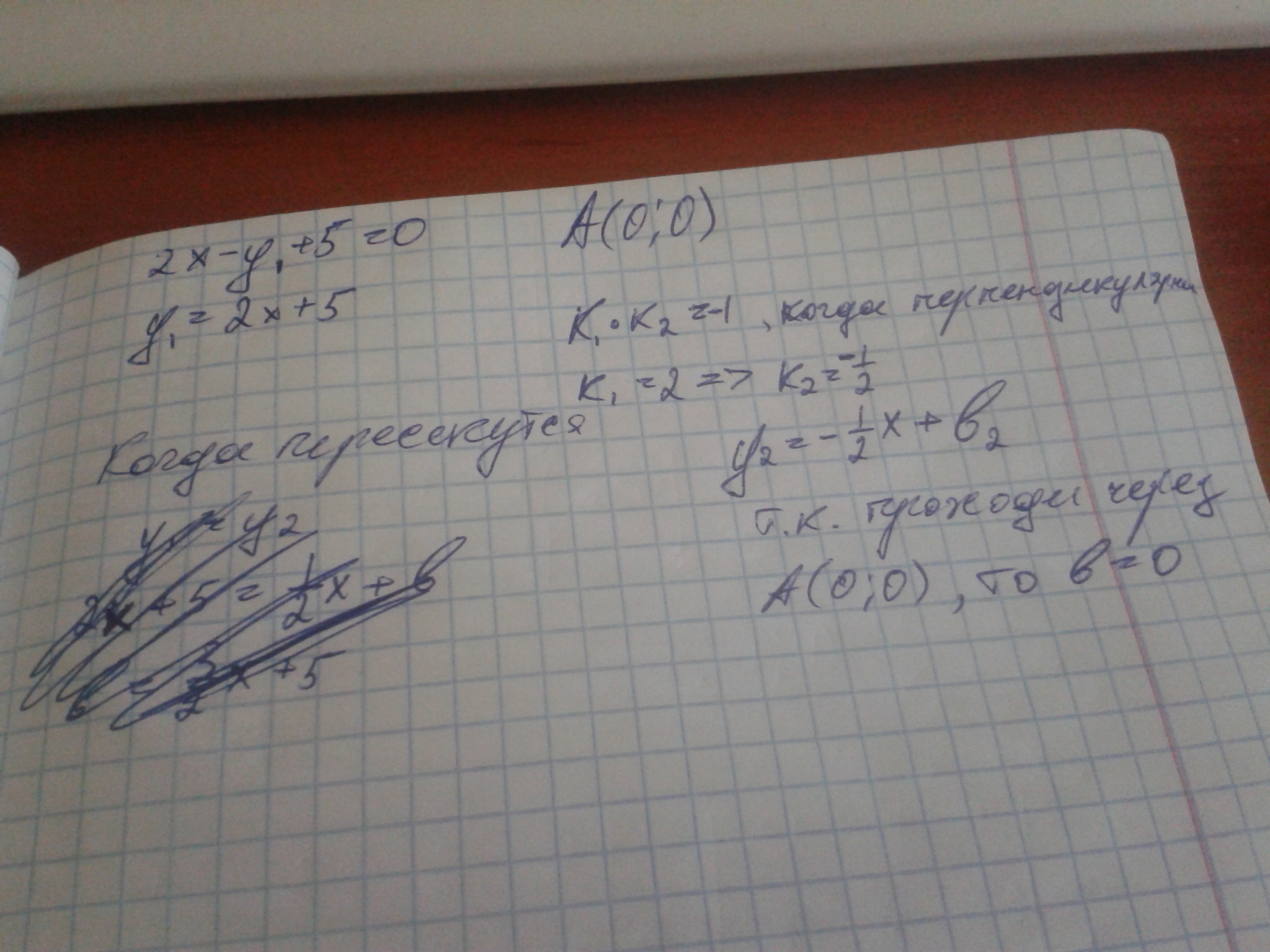 Найти уравнение перпендикулярных прямой 2х-у+5=0, проходящий через точки пересечения с данной прямой с осями координат соответственно. помоги плиззз