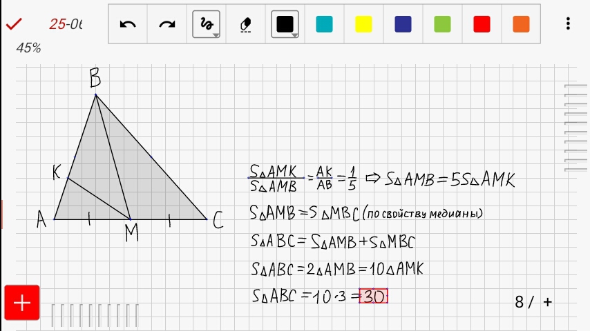 в треугольнике АВС проведена медиана ВМ, на стороне АВ взята точка К так, что АК=1/5АВ, площадь треугольника АМК равна 3, найдите площадь треугольника АВС "