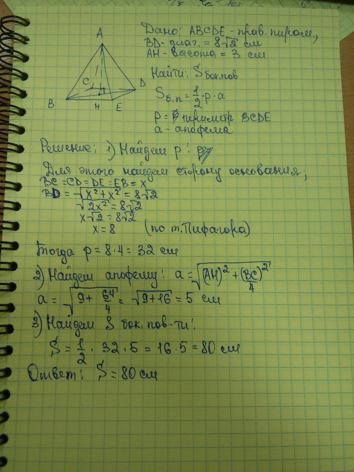 1) В правильной четырехугольной пирамиде диагональ основания равна 8 корней из 2 см,а высота равна 3см. Найдите площадь боковой поверхности.