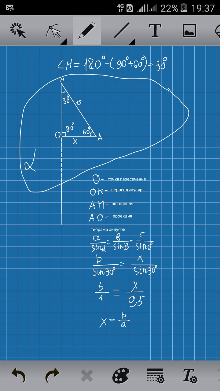 Из точки к плоскости проведены перпендикуляр и наклонная,длина наклонной равна b. Чему равна проекция наклонной,если наклонная составляет с плоскостью