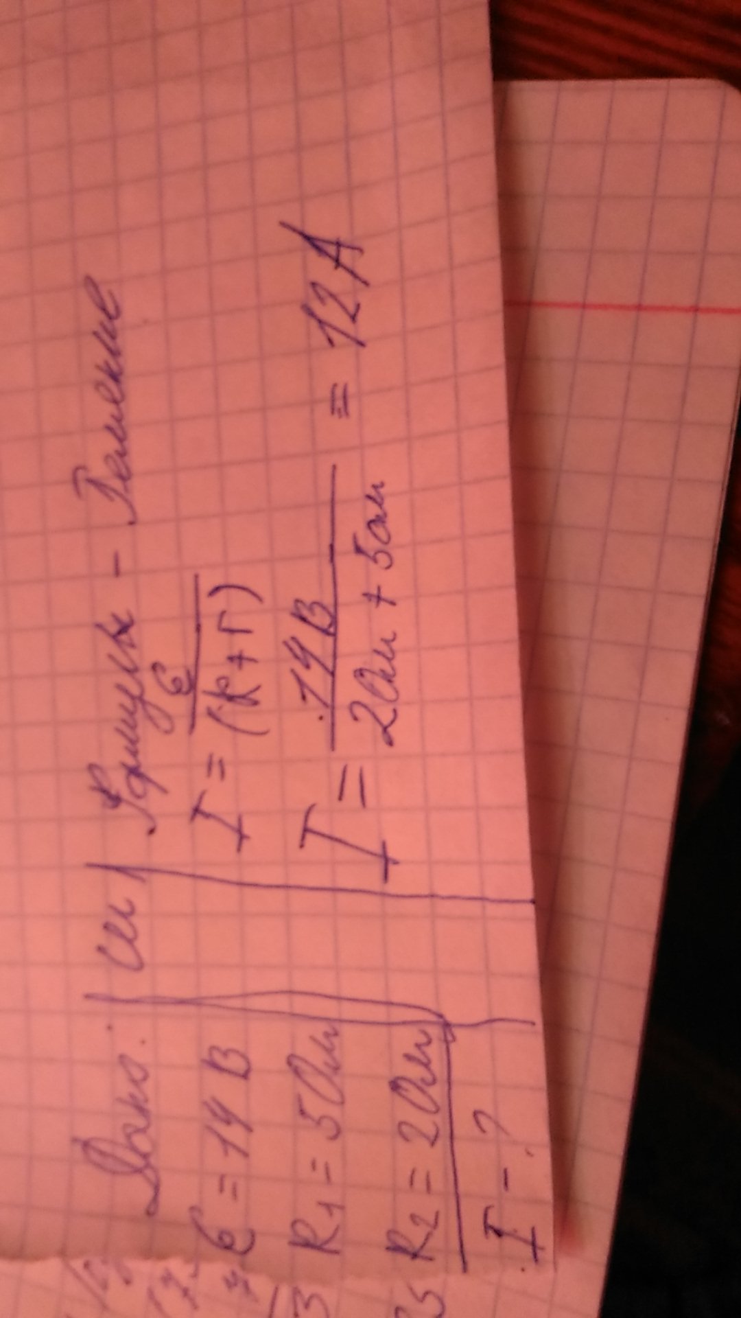 I=E/(r+R)=14 В/(2 Ом+ 5 Ом)=2А