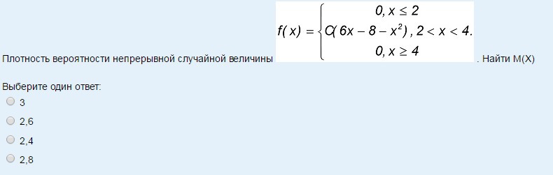 Интеграл от 2 до 4 (6*x-8-x²)dx=1,333 (решение простое, это явно не школа, так что решаем сами), поэтому добавляем множитель 1/1,333 для того что бы площадь под f(x) была равна 1. Матожидание M=интеграл от 2 до 4 (x*(6*x-8-x²)/1,3333)dx=3, так что ответ верхний. Более подробно про формулу расчёта матожидания - учебник Вентцель по теории вероятностей.