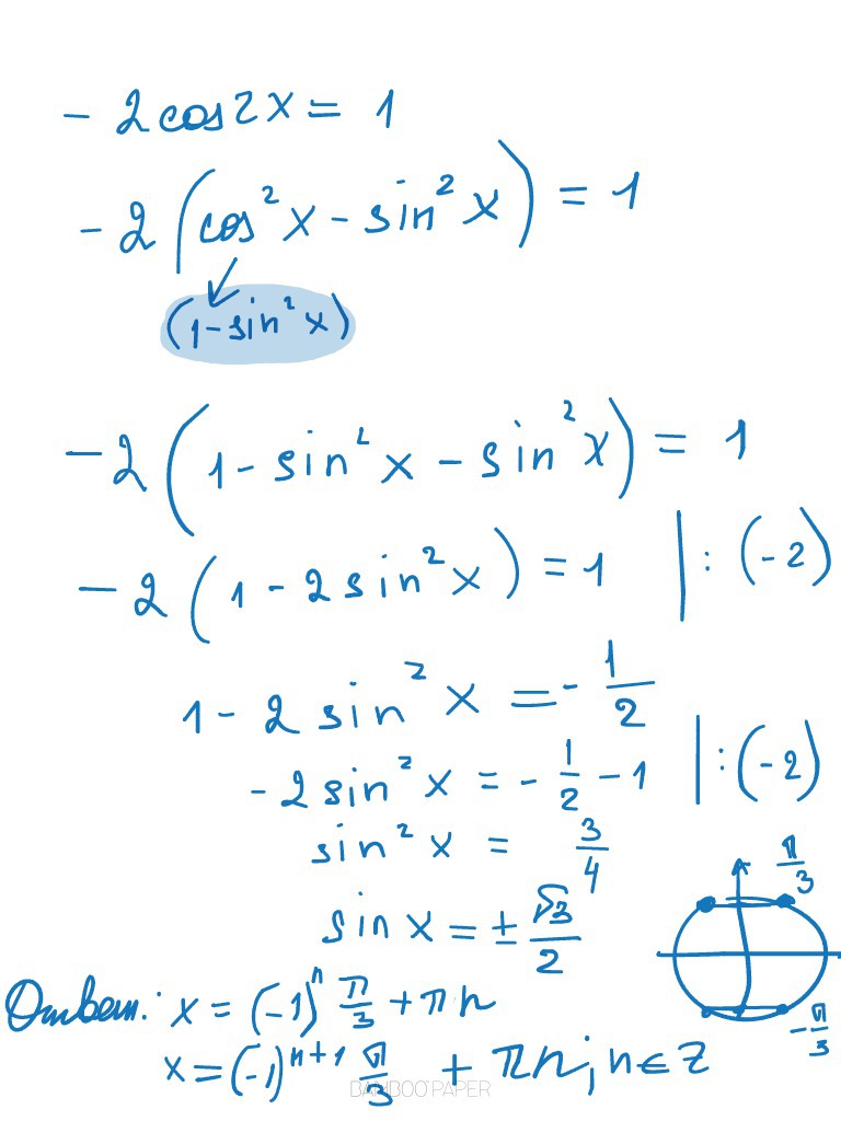 -2cos2x=1 <=> cos2x=-1/2 <=> 2x=+-arccos(-1/2)+2pi*k, k£Z <=> 2x=+-(pi-arccos1/2)+2pi*k <=> 2x=+-2pi/3+2pi*k | : 2 <=>