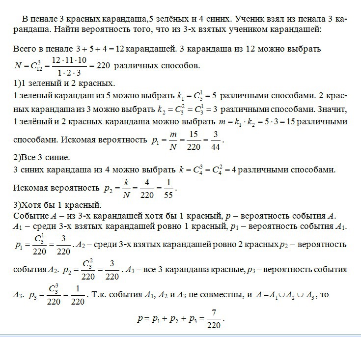 В пенале 3 красных карандаша,5 зелёных и 4 синих.Ученик взял из пенала 3 карандаша.Найти вероятность того,что из 3-х,взятых учеником карандашей:1)1 зеленый и 2 красные,2)Все 3 синие,3)Хотя бы 1 красный.
