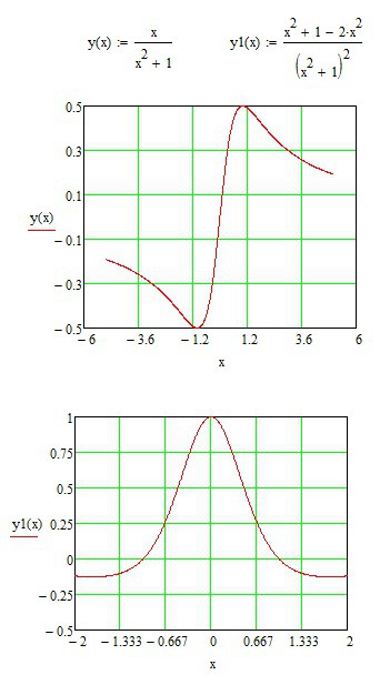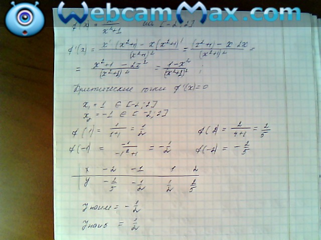 точка max достигается при х=1 и равна y(1)=0,5. Производная табличная, в знаменателе квадрат знаменателя функции, а в числителе производная числителя (1) умноженная на знаменатель минус производная знаменателя (2*х) умноженная на числитель (х).