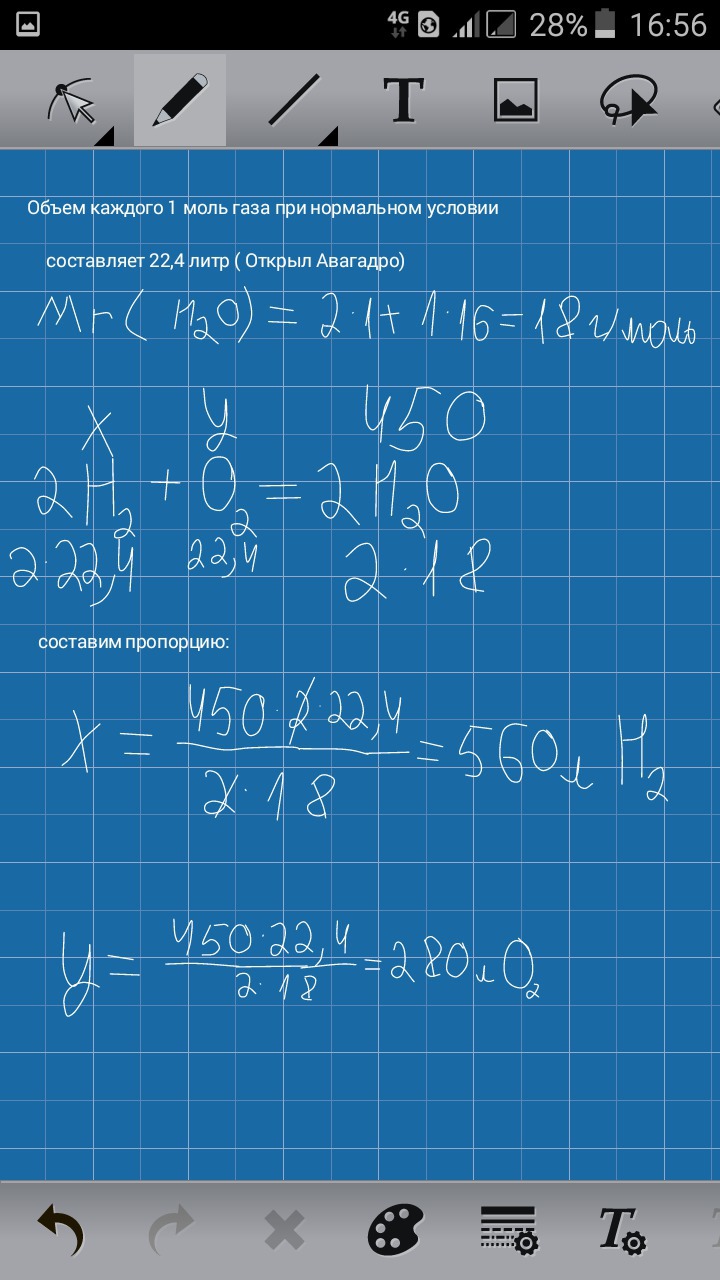 при взаимодействии водорода и кислорода образовалось 450 грамм воды .Чему равен объем водорода и кислорода ,вступивших в реакцию ?