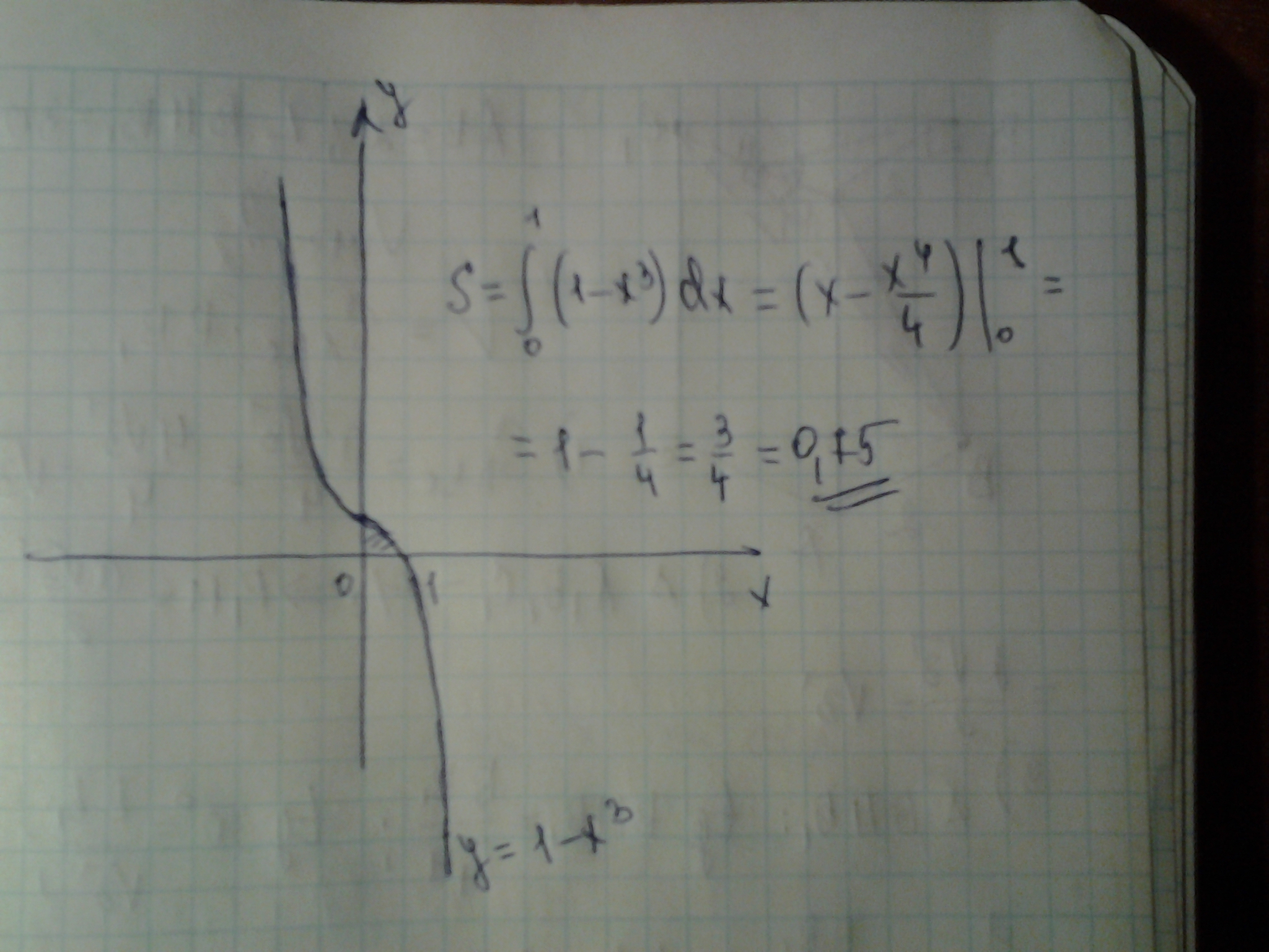 Нужно очень срочно!!! Вычислите (предварительно сделав рисунок) площадь фигуры, ограниченной линиями y=1-x^3, y=0, x=0
