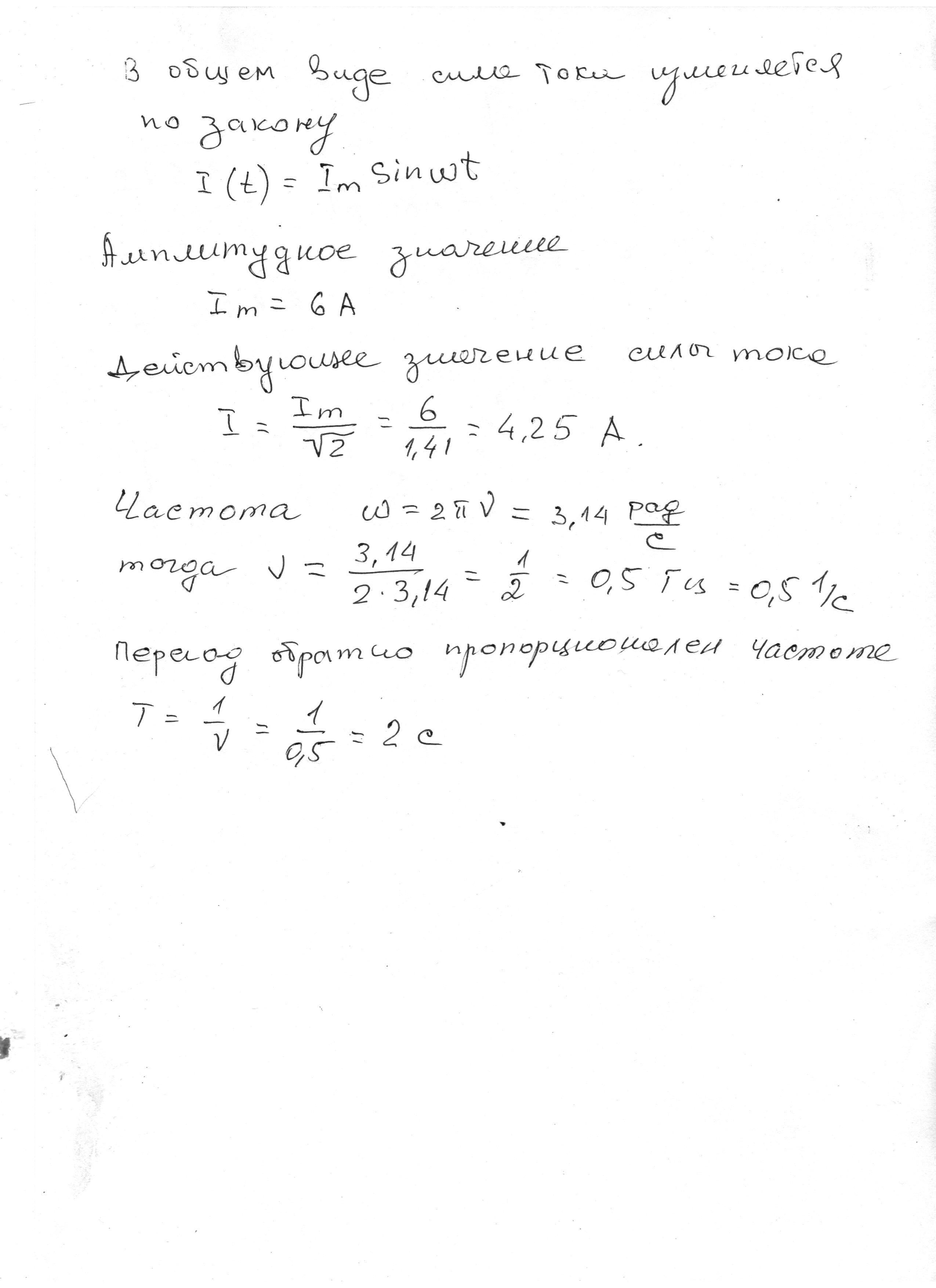 Мгновенное значение силы тока изменится по закону i=6 sin 3.14 t.