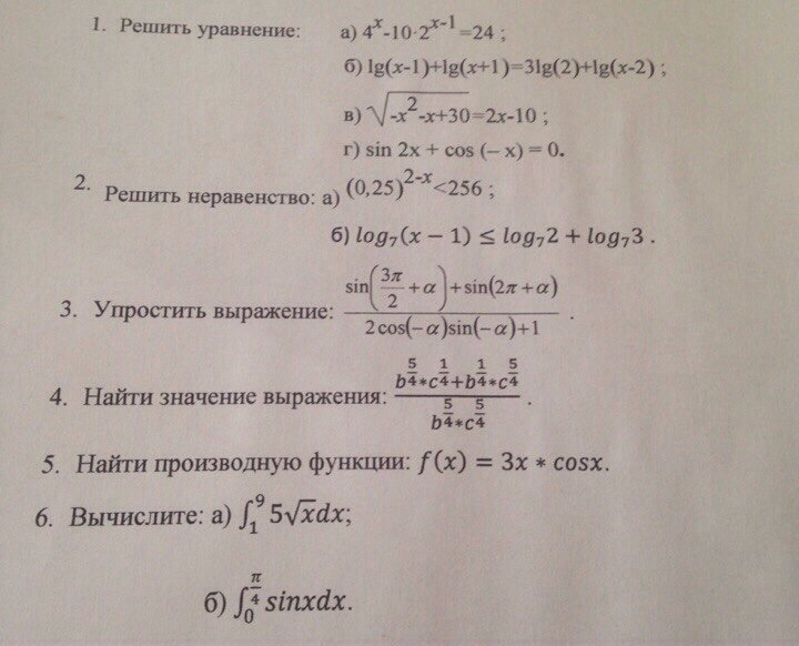 1); ; (0,25)^{2-x} textless  256\\0,25= frac{25}{100} = frac{1}{4} = frac{1}{2^2} =2^{-2}\\2^{-4+2x} textless  2^8\\-4+2x textless  8\\2x textless  12\\x textless  6\\2); ; log_7(x-1) leq log_72+log_73; ,; ; ODZ:; x textgreater  1\\log_7(x-1) leq log_7(2cdot 3)\\x-1 leq 6\\x leq 7\\Otvet:; ; xin (1,7, ]\\3); ; f(x)=3xcdot cosx\\f'(x)=3cosx-3xcdot sinx\\4); ; intlimits _1^95sqrt{x}, dx=5cdot frac{x^{frac{3}{2}}}{frac{3}{2}}left |_1^9=frac{10}{3}(9^{frac{3}{2}}-1)=frac{10}{3}(3^3-1)=86frac{2}{3}